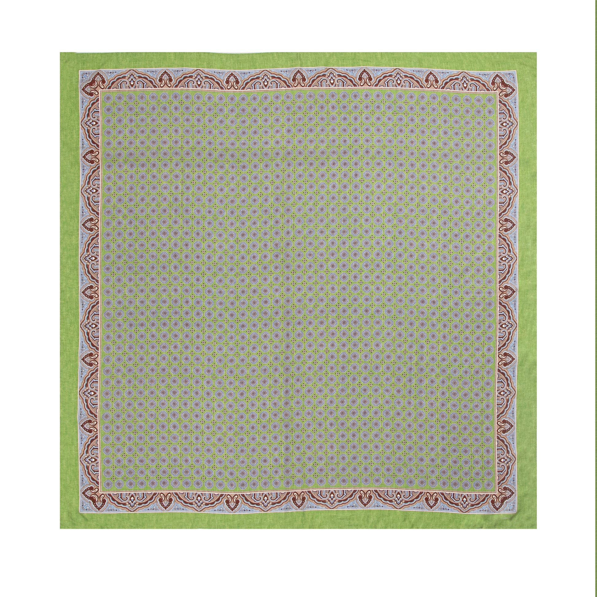 A delicate, elegant take on middle eastern style. Micro-circles in Sage Green and Light Blue rest on a Meadow Green background, complemented by a terracotta/brown border.
