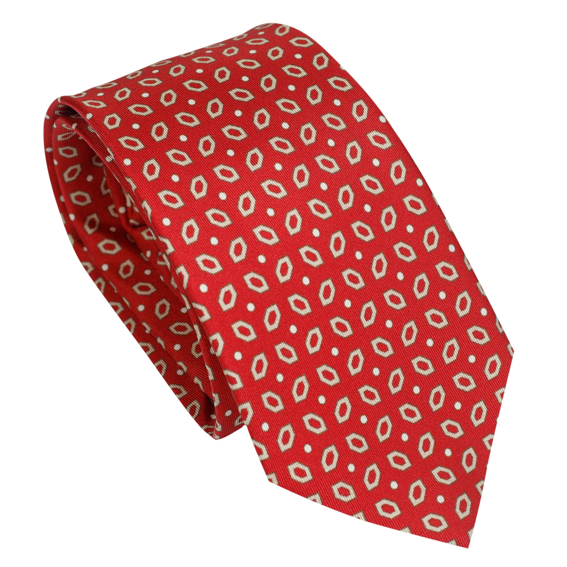 Cravatta in pura seta italiana al 100% con fondo rosso unito e microelementi geometrici color crema distribuiti uniformemente. Elegante ma contemporanea, perfetta per chi desidera aggiungere colore in modo composto e sofisticato.