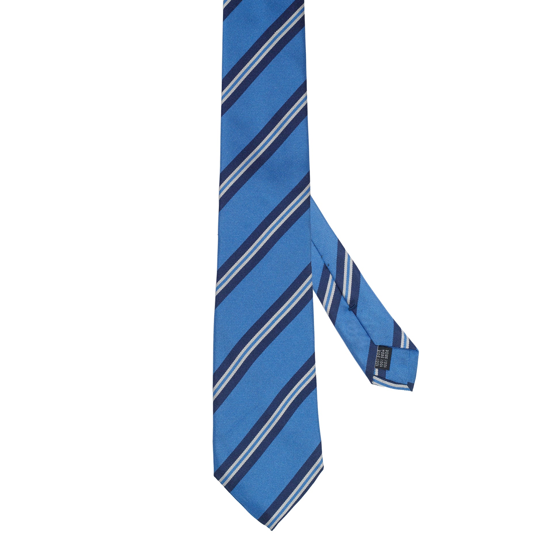 Cravatta in seta italiana al 100% blu brillante con righe azzurre e avorio