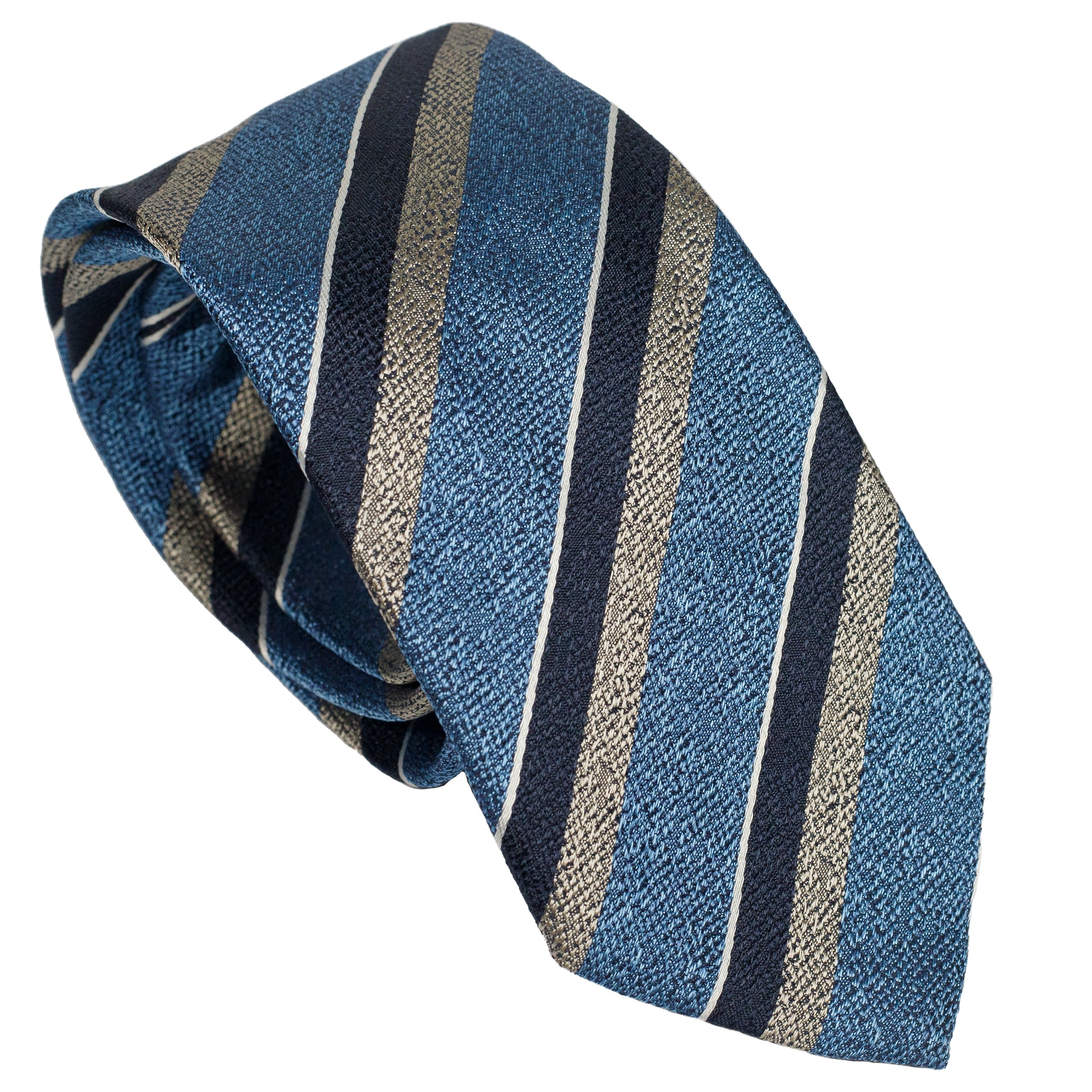 Cravatta regimental in pura seta italiana al 100%, azzurra, con sfondo azzurro e righe diagonali blu navy alternate a righe grigie a contrasto. Una palette luminosa ma equilibrata che aggiunge carattere senza esagerare. Perfetta per look business moderni e raffinati.