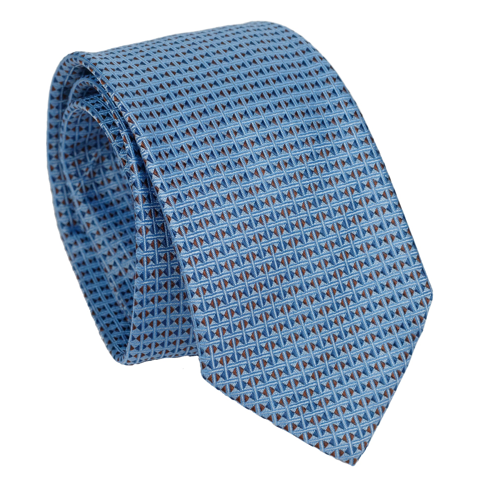 Cravatta azzurra in pura seta italiana al 100% con motivo geometrico a micro triangoli nei toni del blu scuro. Elegante, raffinata e visivamente molto pulita, perfetta per look business contemporanei con carattere ma al tempo stesso equilibrati.