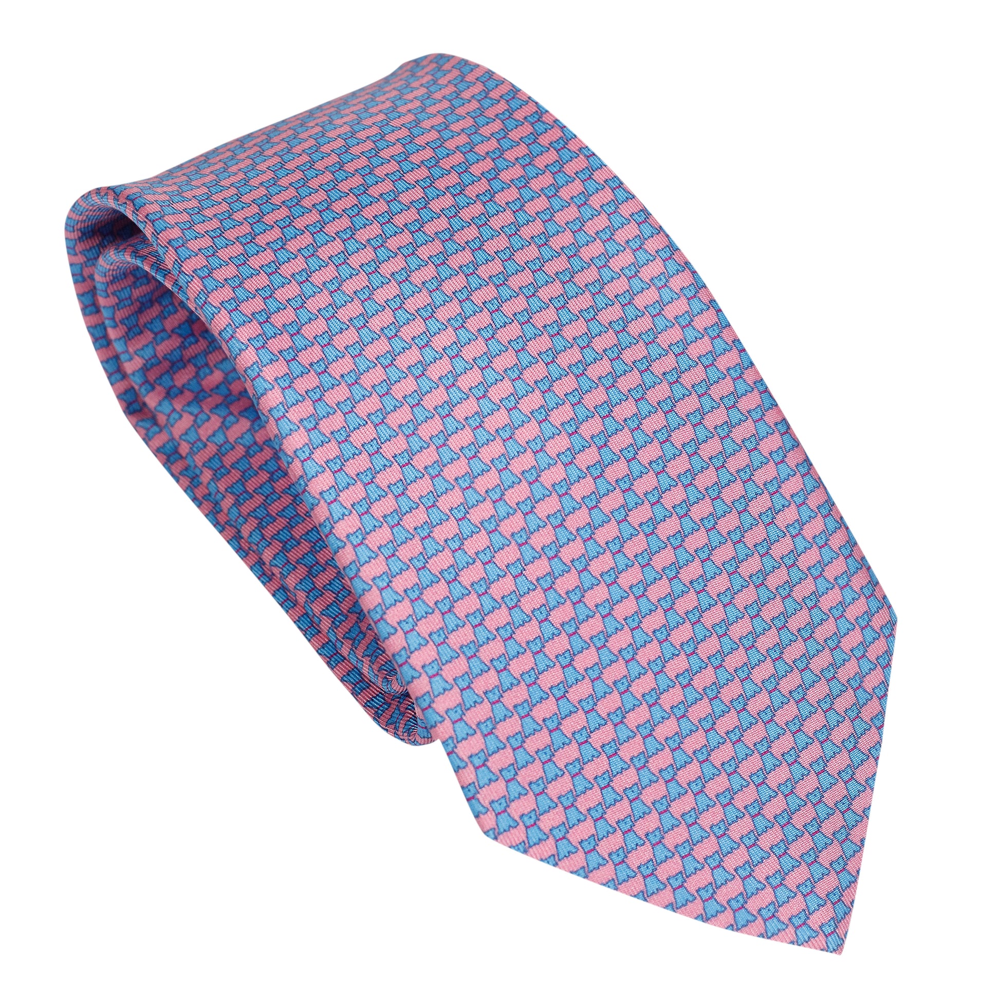 Cravatta azzurra in 100% seta italiana caratterizzata da un raffinato motivo micro-geometrico nei toni del rosa su sfondo azzurro. Un'opzione luminosa, delicata ma sofisticata, perfetta per aggiungere freschezza a un outfit.