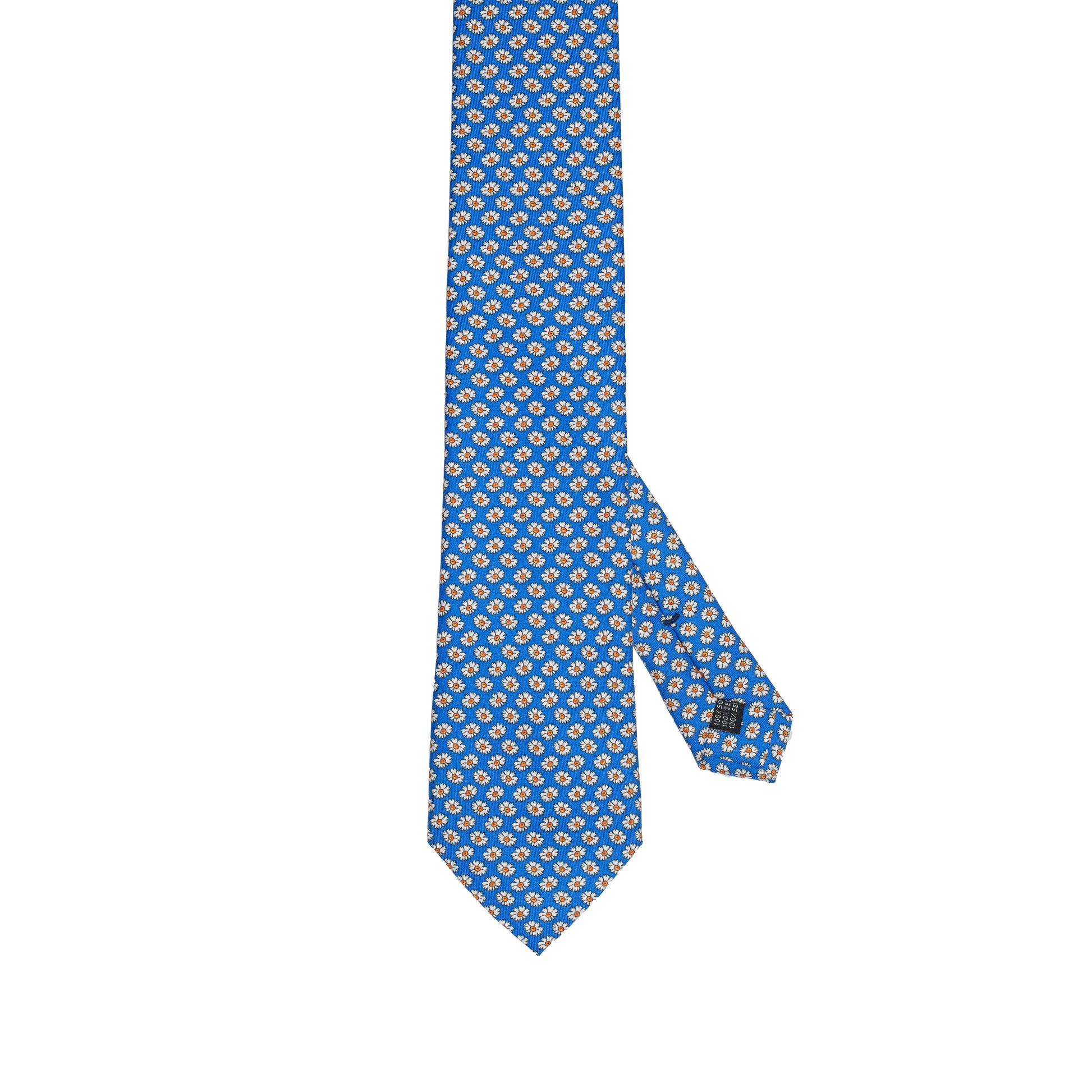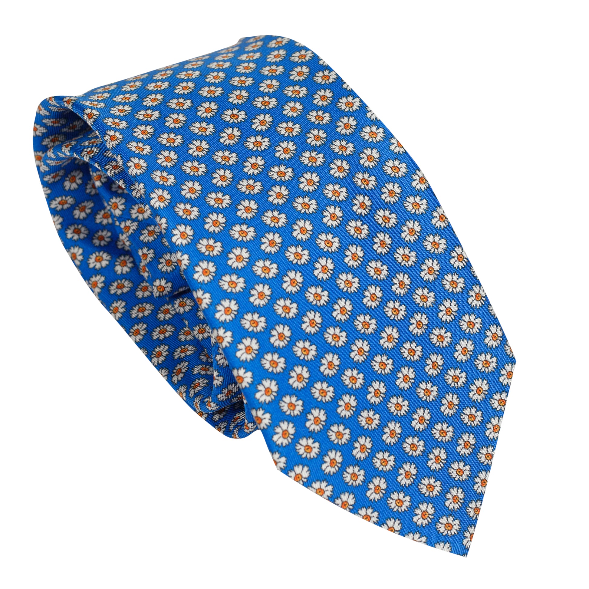 Cravatta azzurra in pura seta italiana al 100% con piccoli fiori arancioni e blu. Elegante ma luminosa, perfetta per look estivi, cerimonie diurne e outfit sartoriali che desiderano un tocco di colore senza eccessi.